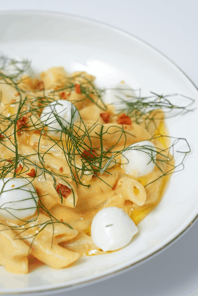 Tagliatelle cu gorgonzola, guanciale, măr și migdale