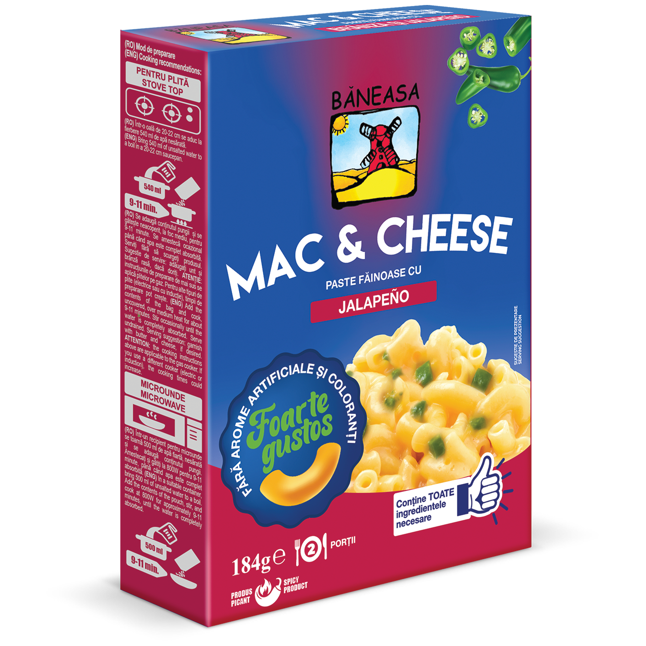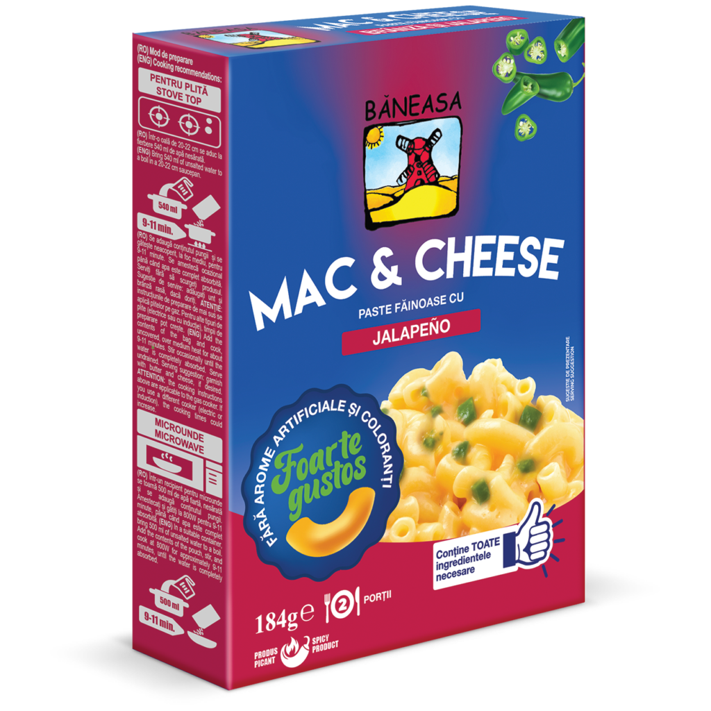 Mac & Cheese Jalapeno aduce un plus de energie rețetei clasice, printr-o combinație cremoasă de paste și brânză completată de note ușor picante de jalapeno. Este alegerea ideală pentru cei care preferă gusturile mai intense și vor să transforme o masă rapidă într-o experiență plină de personalitate, fără a renunța la simplitatea preparării. Aroma ușor picantă echilibrează perfect textura cremoasă a sosului, oferind un gust plin și dinamic, care iese din tiparele obișnuite ale preparatelor rapide. Rezultatul este un produs modern, potrivit pentru cei care apreciază combinațiile îndrăznețe.