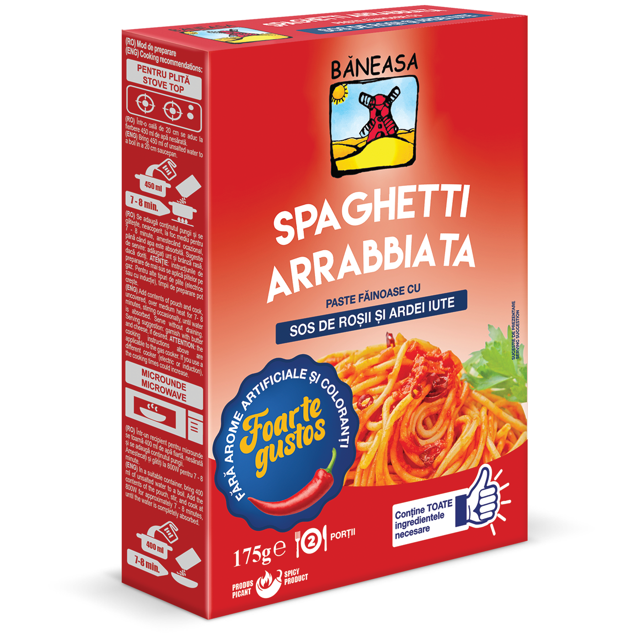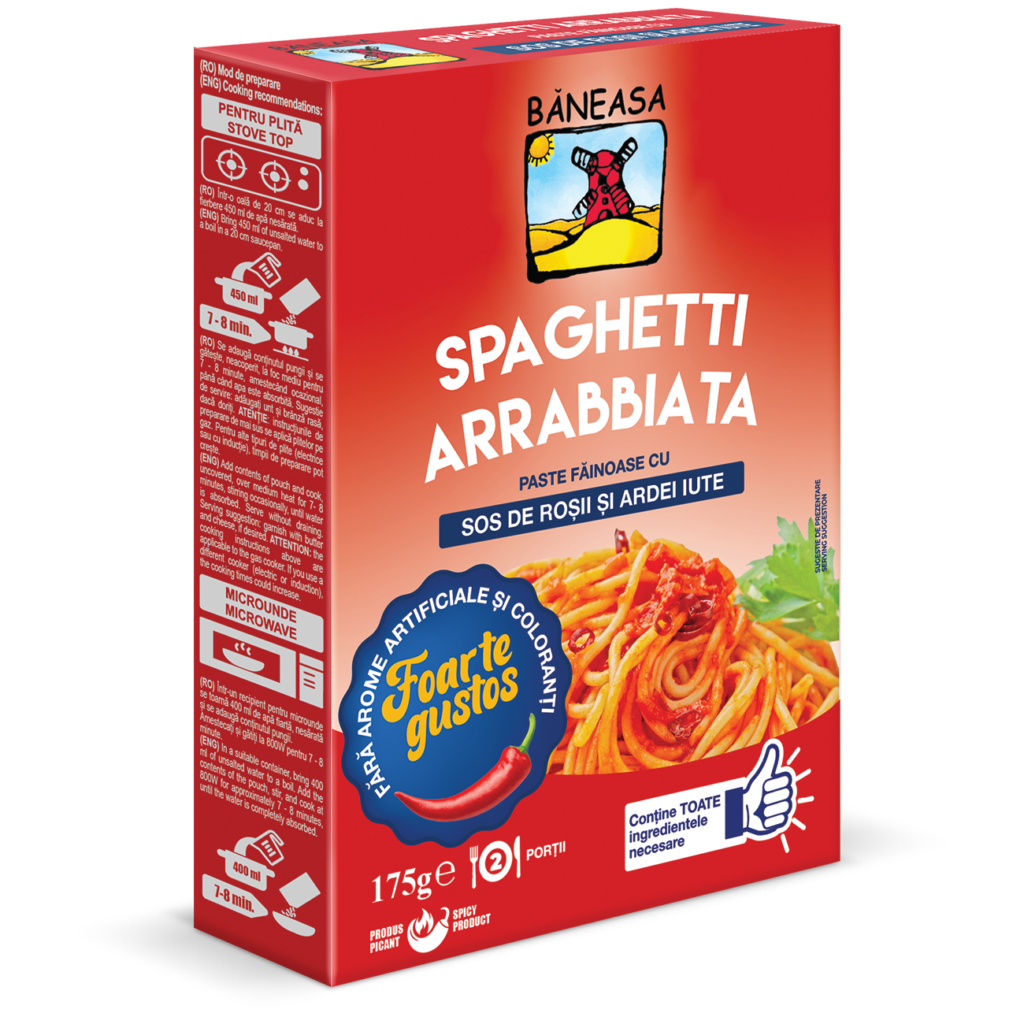 Spaghetti Arrabbiata aduce în gama Băneasa Ready to Cook o rețetă cu spirit mediteranean, construită în jurul simplității bine controlate și a aromelor clare. Sosul de roșii, intens și expresiv, este completat de accente condimentate care îi conferă dinamism și profunzime, rezultând un preparat cu un gust intens și ușor de recunoscut. Acest sortiment este destinat consumatorilor care caută o masă cu caracter, dar care nu presupune timp îndelungat de gătire sau pași suplimentari. Spaghetti Arrabbiata oferă o alternativă practică pentru momentele în care pofta de un gust autentic este la fel de importantă ca rapiditatea preparării, reușind să îmbine eficiența cu plăcerea unei rețete clasice reinterpretate.