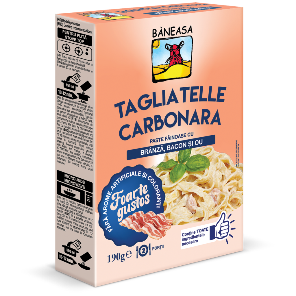 Tagliatelle Carbonara se bazează pe un sos cremos, bine legat, care aderă uniform la pastele late, punând în valoare textura acestora, iar bucățile de bacon adaugă profunzime gustului și o notă delicioasă care completează armonios ansamblul. Astfel, Tagliatellele Carbonara Băneasa combină cu succes, într-un format Ready to Cook, cremozitatea sosului, textura pastelor și aroma specifică baconului, pentru a oferi rezultate constante și ușor de obținut. Produsul devine astfel o alegere sigură pentru mesele de seară sau pentru momentele în care se dorește un preparat reconfortant, gustos și simplu de preparat, care inspiră sentimentul unei mese gătite cu atenție, de fiecare dată.