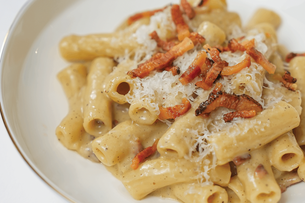 Lasă-te purtat de aromele calde și textura catifelată ale pastelor Tortiglioni Carbonara, un preparat care se dezvăluie încet, de la prima îmbucătură până la ultima. Sosul bogat, care învăluie cu delicatețe pastele, guanciale-ul crocant și notele intense de Pecorino creează un echilibru care îndeamnă la răgaz și bucurie.