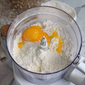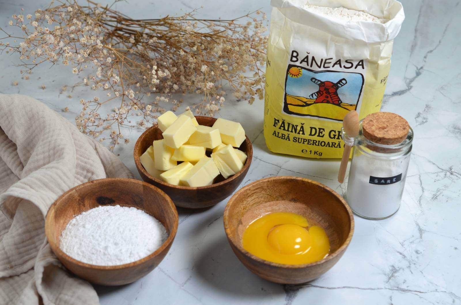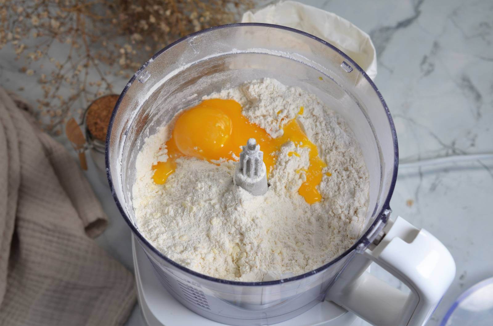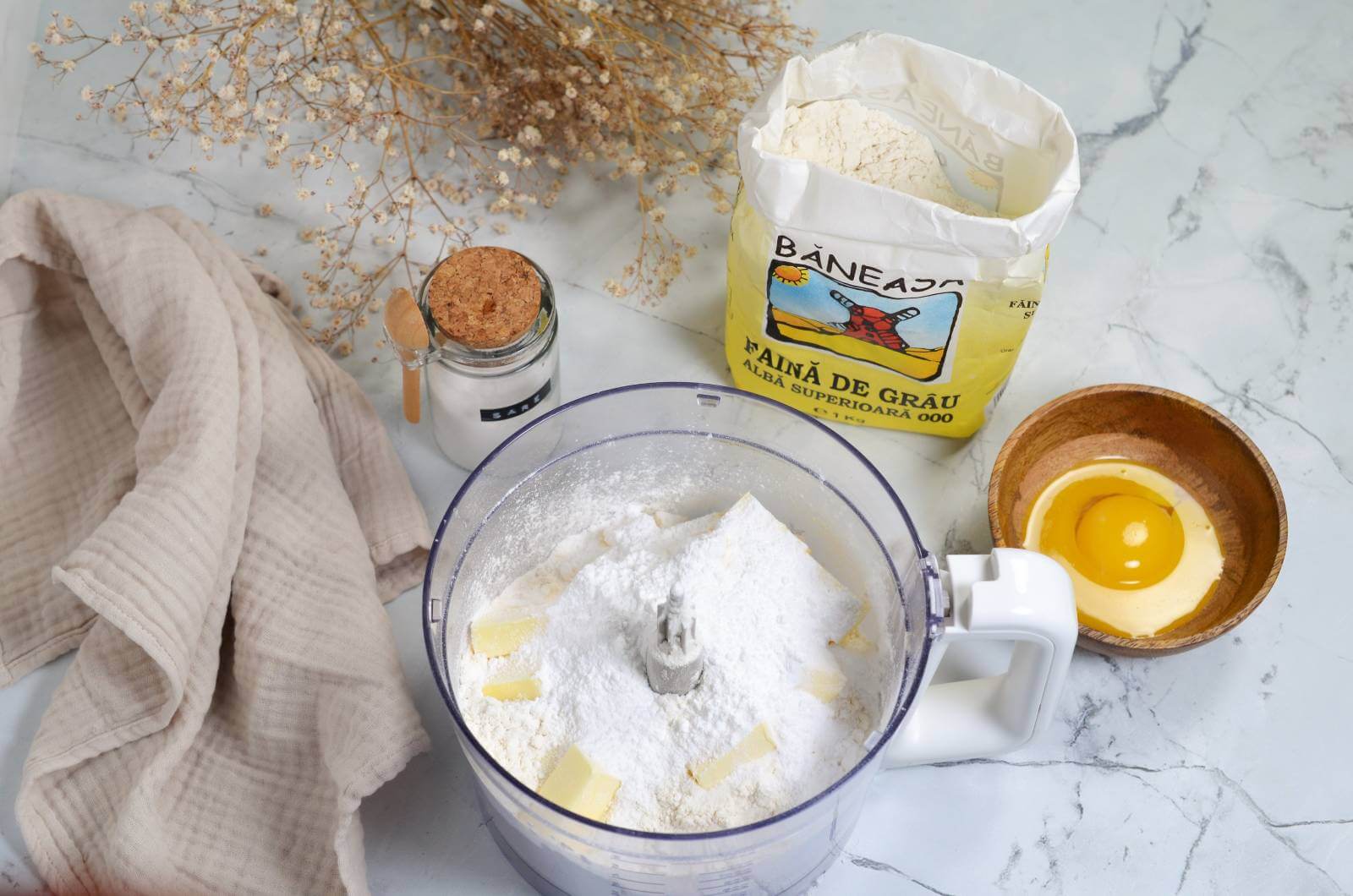 Punem în blender făina, untul, zahărul pudră, sarea. Amestecăm câteva secunde, până compoziția arată ca un pesmet granulat mare. Adăugăm gălbenușurile și continuăm să mixăm. Adăugăm 2 linguri apă foarte rece. Aluatul se va lega foarte rapid.