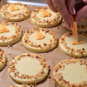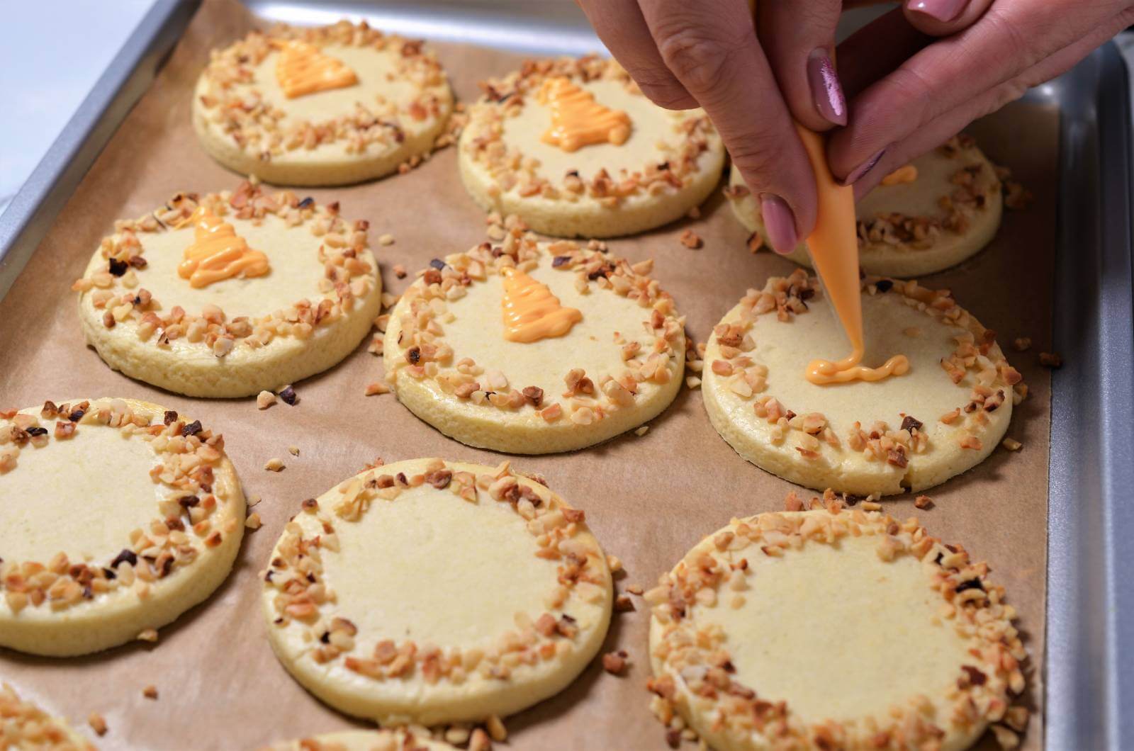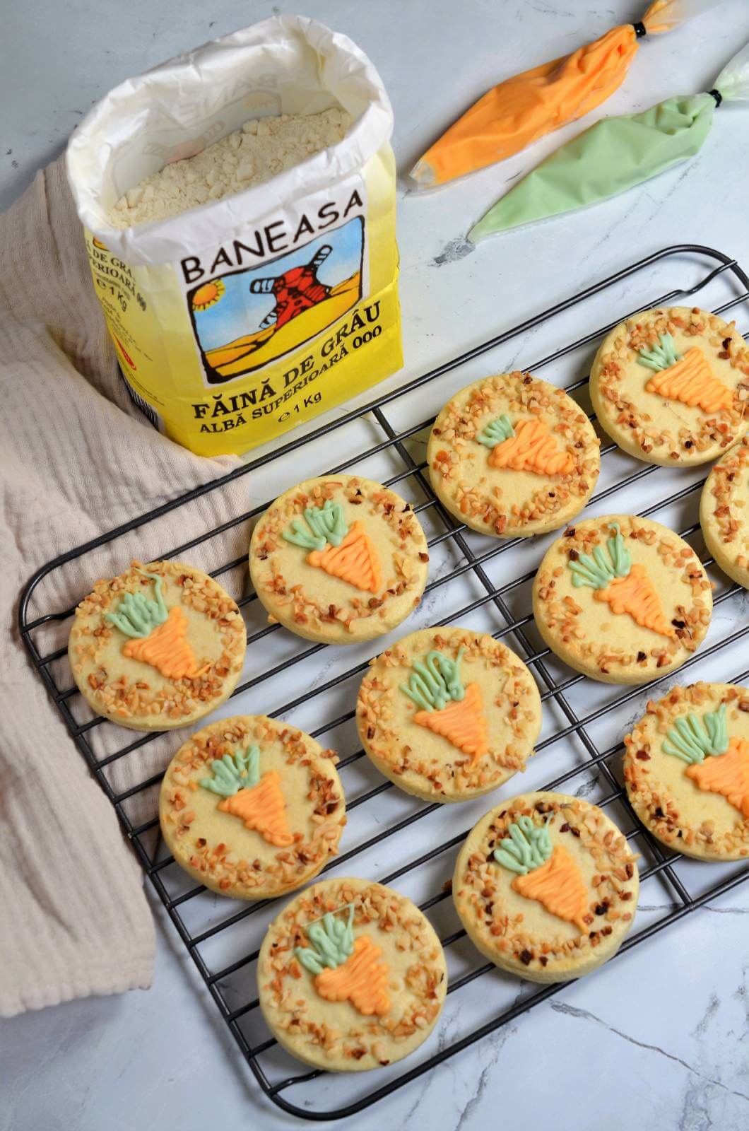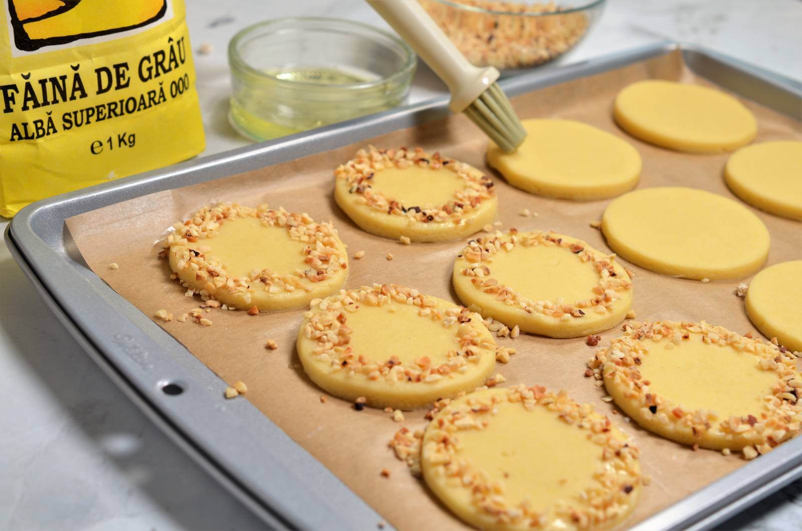 Așezăm biscuiții în tavă, pe hârtie de copt. Ungem marginile cu albuș, presărăm nuci/alune măcinate. Coacem 10-12 min în cuptorul încins la 180°C. Decorăm biscuiții cu glazură colorată.