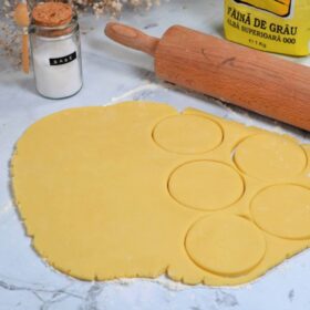 Decupăm biscuiții. Remodelăm aluatul rămas, îl întindem din nou, decupăm alți biscuiți.