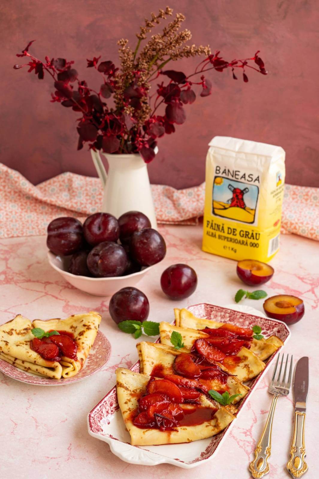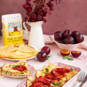 După câteva secunde întoarce clătita și pe partea cealaltă și coace până este gata. Repetă operațiunea și cu restul de compoziție. Împăturește clătitele în 4, așază-le pe un platou. Pe deasupra lor, toarnă sosul de prune. Dacă îți place menta, poți garnisi deasupra cu câteva frunzulițe. Poți adăuga și un glob de înghețată sau puțină frișcă dacă dorești.
