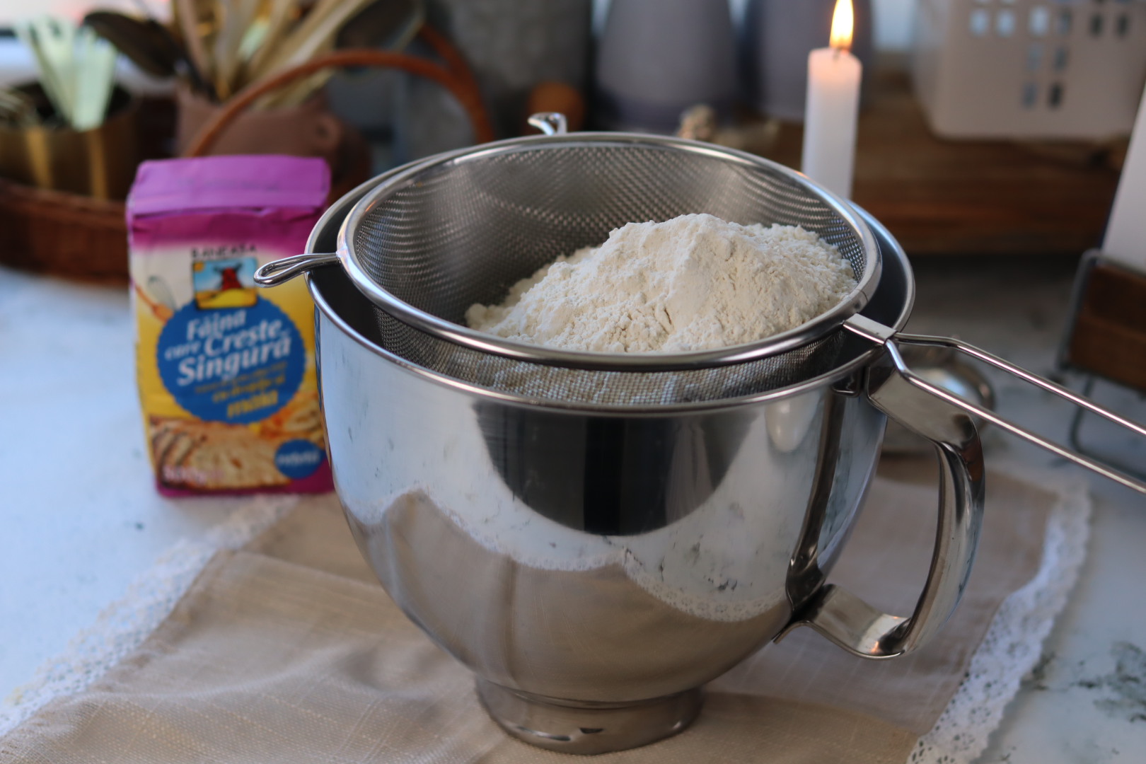 Cerne făina într-un bol mare sau în bolul mixerului. Separat, freacă gălbenușurile cu sarea.