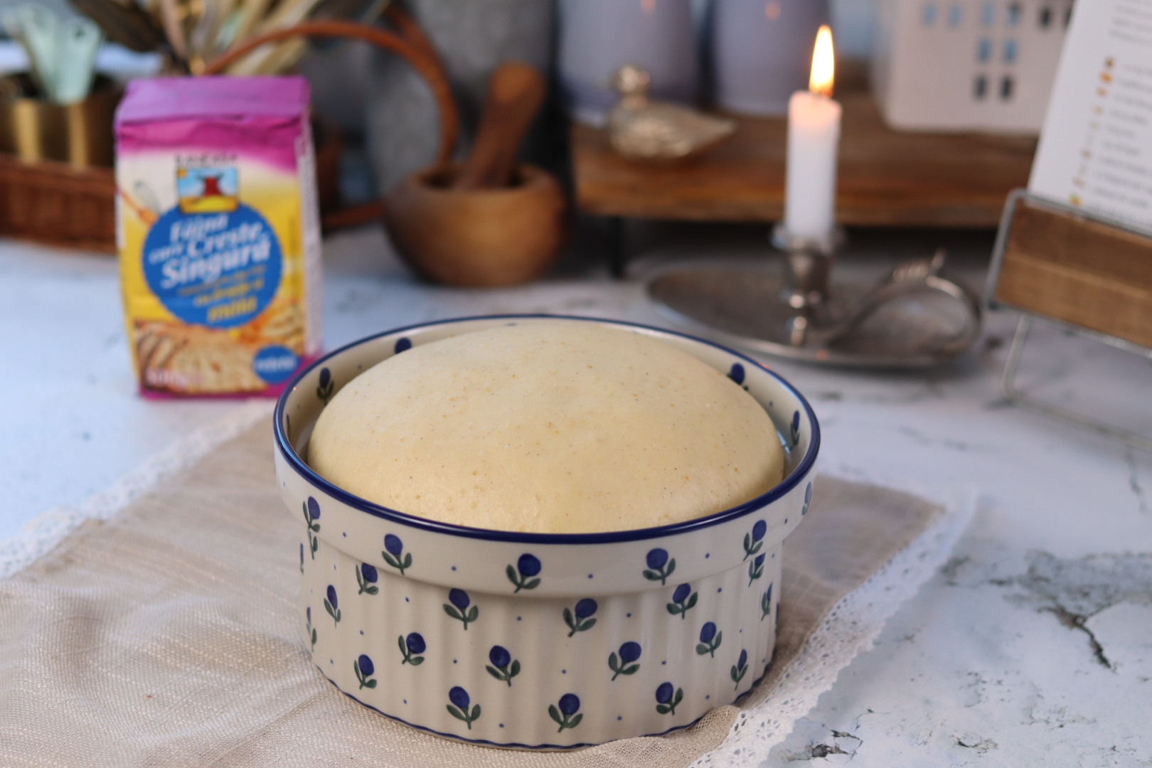 Formează o bilă de aluat și așaz-o într-un bol uns cu ulei, apoi acoper-o cu folie alimentară. Lasă la dospit aprox. 2 ore, într-un loc cald, până își dublează volumul. (Poți folosi cuptorul oprit, cu becul aprins.)