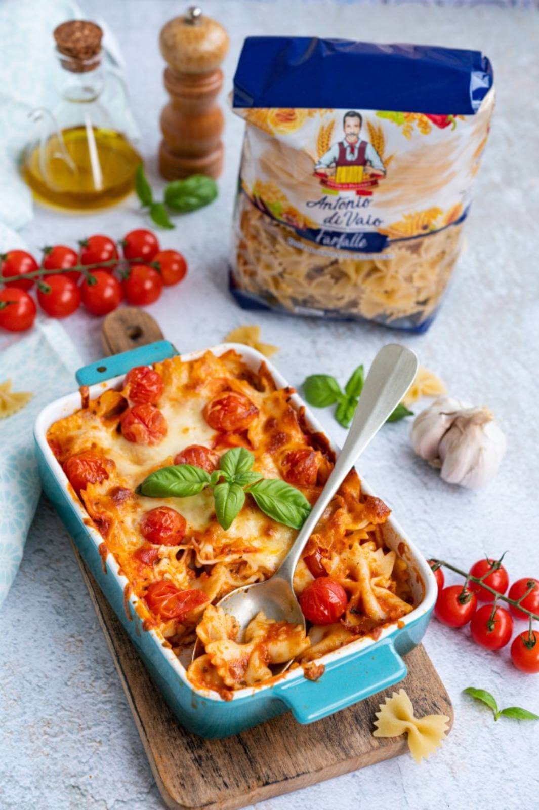 Pentru astăzi, eu am ales pastele de la Antonio di Vaio care sunt tot marca Băneasa. Și ca să fie totul și mai drăguț, am ales pastele farfalle sau fundițe. Bineînțeles că voi puteți alege și altă formă de paste, precum penne sau fusili.