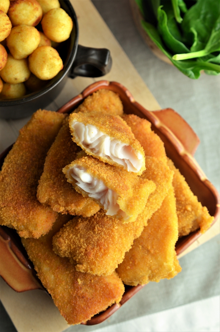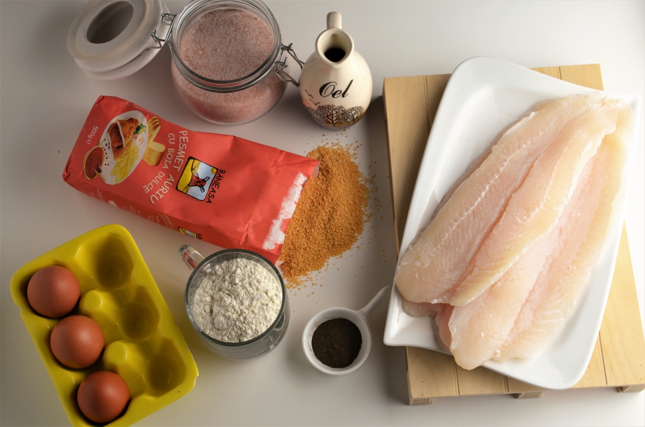 Eu am prăjit peștele în pesmet în baie de ulei, dar puteți, la fel de bine, să așezați file-urile de pește, o dată impesmetate în tavă, pe hârtie de copt și să le coaceți la 180°C timp de 25-30 minute, timp în care trebuie să le întoarceți de cel puțin 2 ori, pentru a vă asigura că se rumenesc uniform și crusta va fi aurie