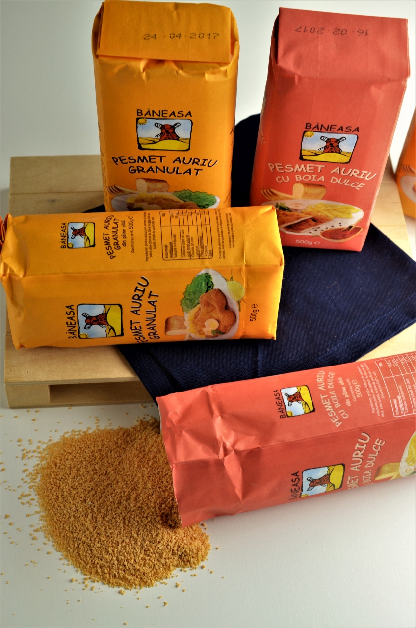 Azi vreau să vă vorbesc despre cele 3 sortimente de pesmet de la Băneasa, care îmi fac viața mai ușoară în bucătărie: pesmet auriu granulat, pesmet auriu cu boia dulce și pesmet alb din pâine. Pesmetul alb, din pâine este pesmetul clasic, pe care îl folosesc la diverse prăjituri (cum ar fi Prăjitură de mere), pentru rețeta de Papanași fierți, Gomboti cu prune sau alte rețete în care este nevoie de un pesmet clasic.