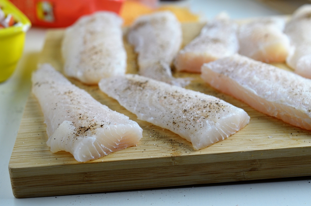 Spălăm fileul de pește cu apă rece și îl uscăm foarte bine, tamponând cu șervețele de hârtie. Pipăim fiecare bucată de pește și îndepărtăm cu grijă eventualele oase, cu ajutorul unei pensete.