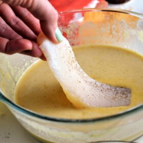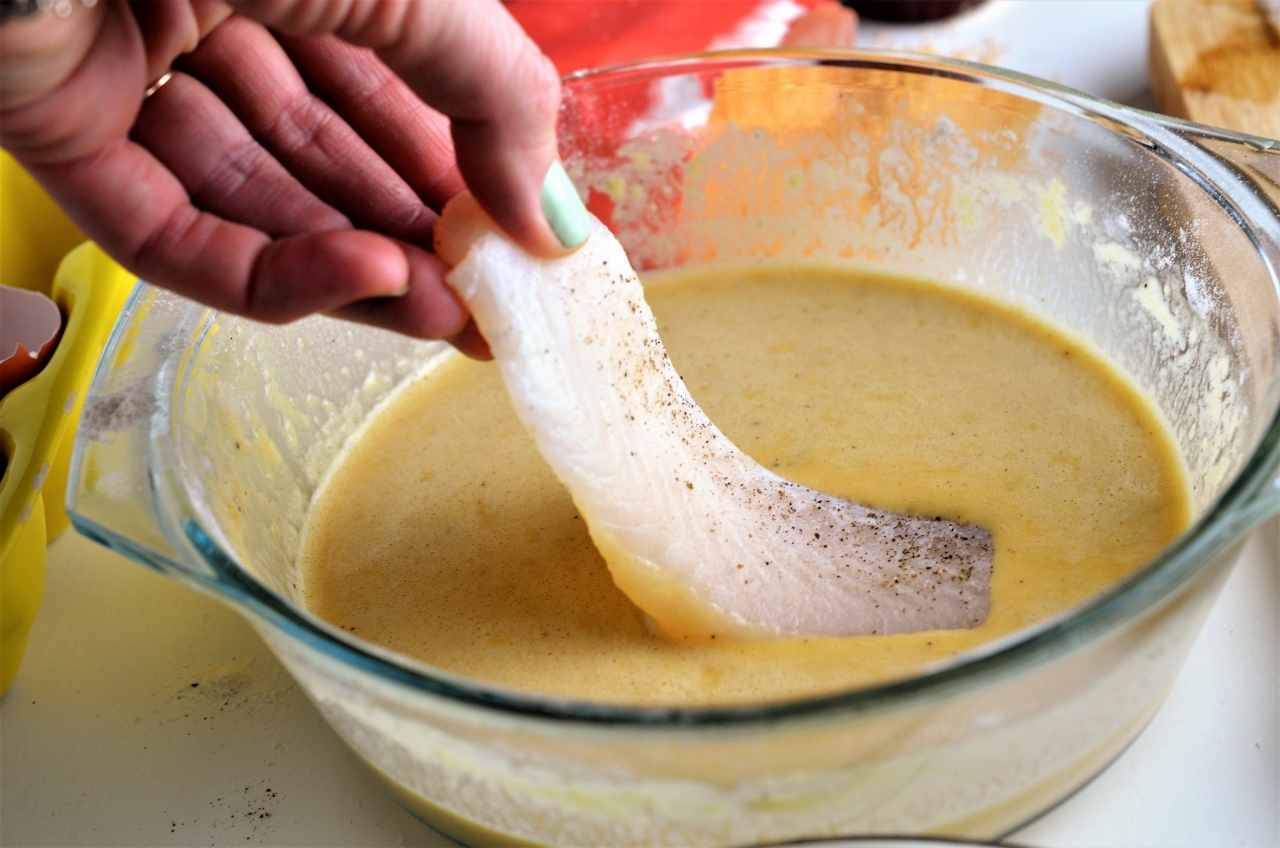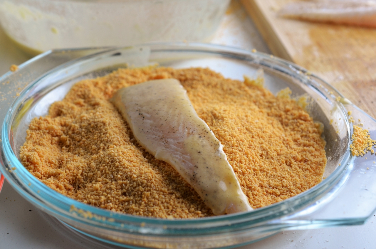 Dăm fiecare bucată de pește prin aluat, apoi prin pesmet, apșsând bine pentru a forma o crustă groasă, uniformă.
