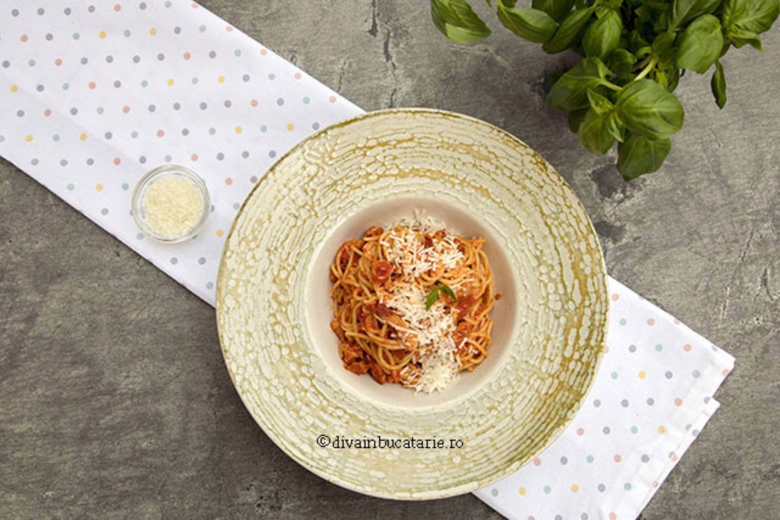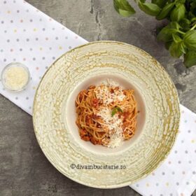 În concluzie, pentru rețeta de spaghetti all’Amatriciana ai nevoie de spaghetti, guanciale(bacon), pulpă de rosii, ardei iute și brânză pecorino.