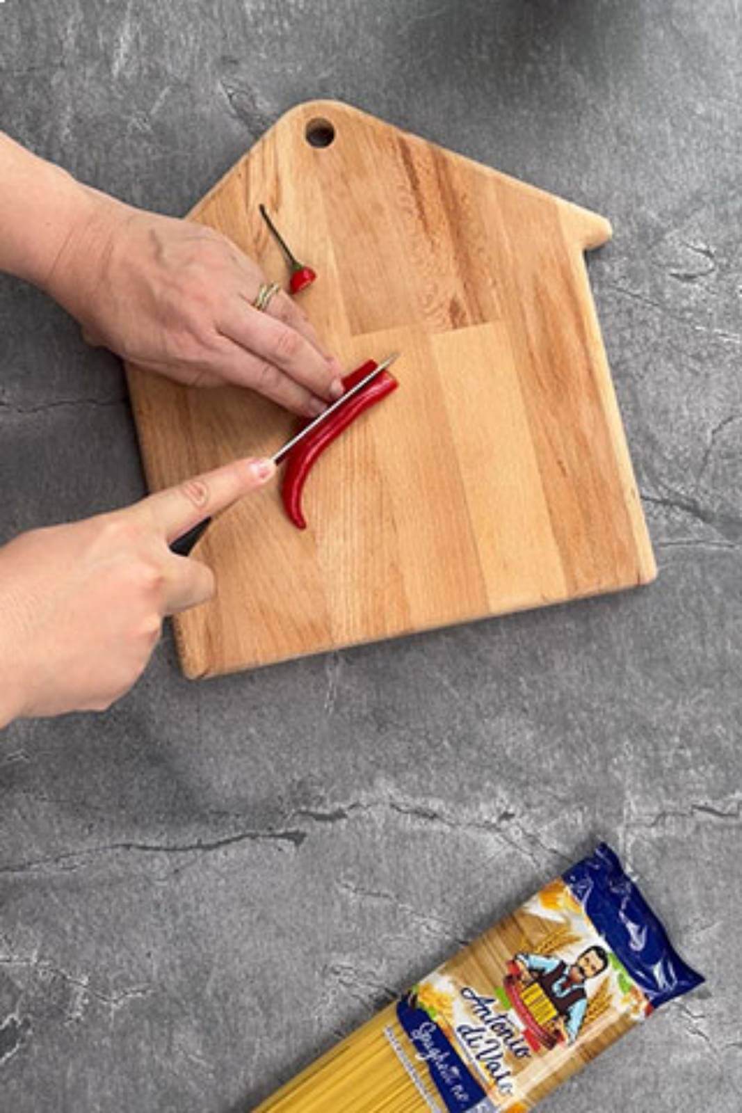 Am pus apă pentru paste la fiert. În acest timp, am ras brânză Pecorino Romano. Am tăiat un ardei iute în jumătate pe lungime și am îndepărtat semințele.