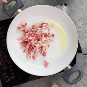 Într-o tigaie foarte largă și adâncă, am încins puțin ulei de măsline. Nu am găsit slănină crud uscată, așa că am folost niște bacon tăiat fâșii. L-am lăsat pe foc până când s-a rumenit frumos. Am stins cu vin și am lăsat până când alcoolul s-a evaporat.