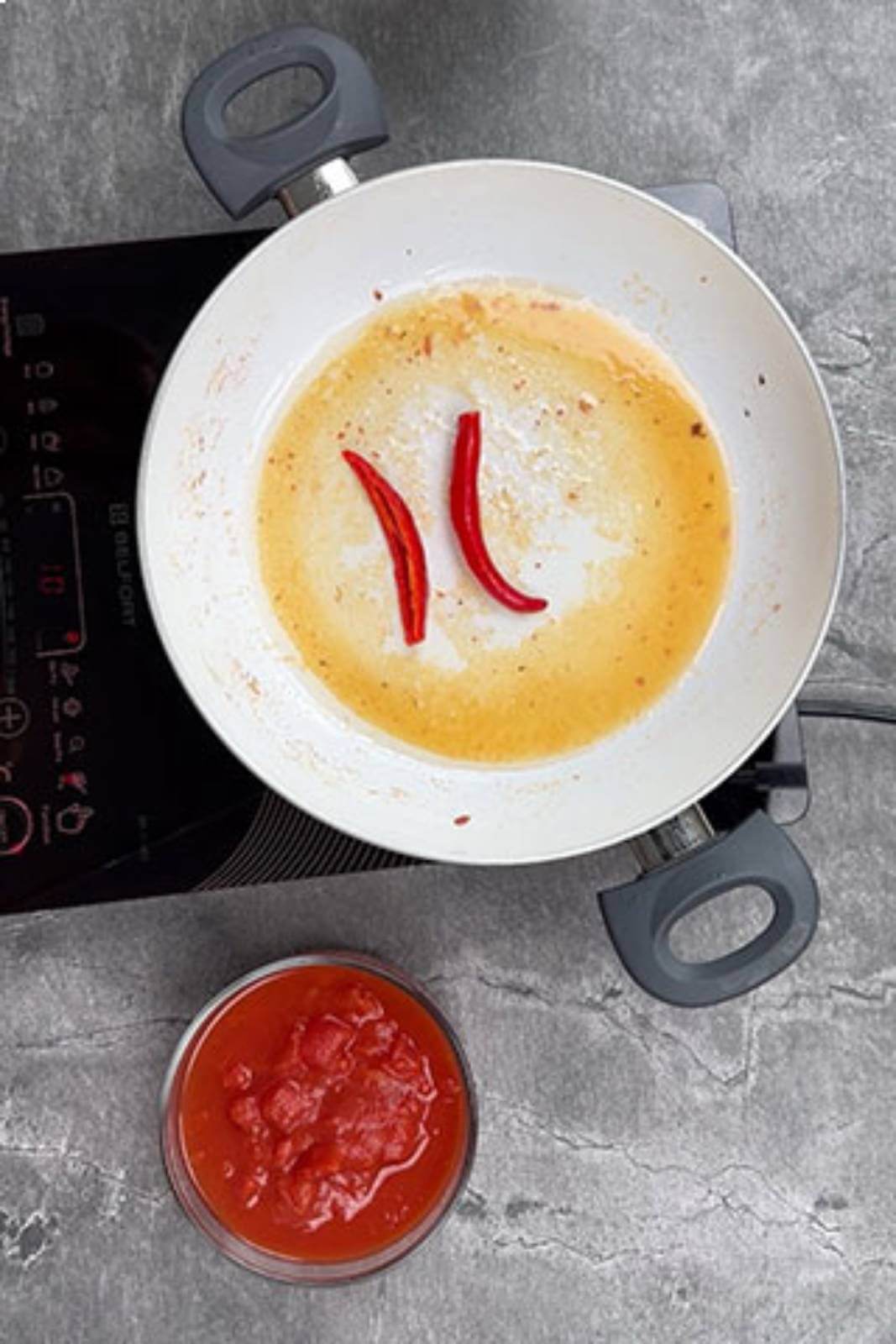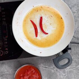 Am scos baconul din tigaie și am pus ardeiul iute. L-am lăsat în jur de 1 minut, apoi am adăugat pulpă de roșii și am asezonat cu sare și piper.