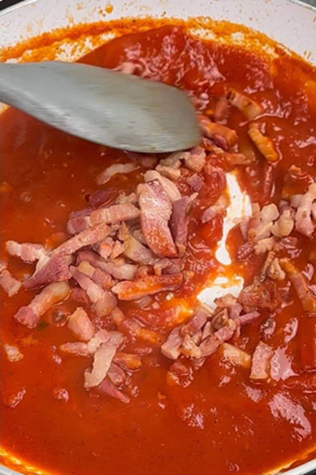 După proximativ 8 minute de fiert la foc mic, am scos ardeiul iute, am pus baconul înapoi în tigaie și am mai lăsat să fiarbă împreună.