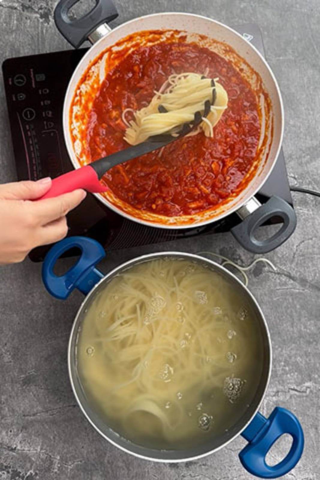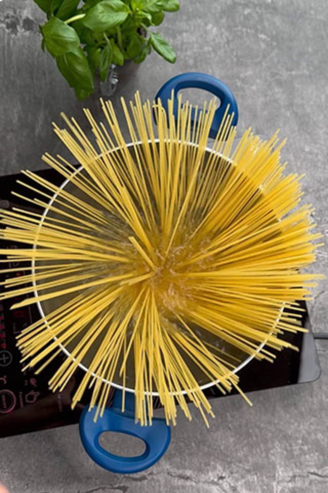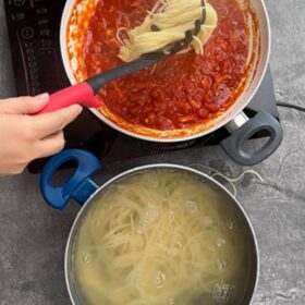 Când apa a dat în clocot, am adăugat sare, apoi am pus spaghetti la fiert. Le-am lăsat să fiarbă timp de 8 minute.