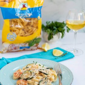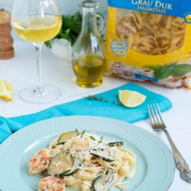 Tagliatelle cu creveți, într-un sos cremos cu mascarpone, creveți și zuchinni. Un fel de mâncare de vară rapid și delicios!
